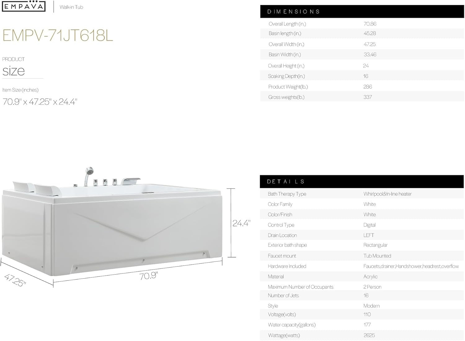 Empava EMPV-71JT618L 71"L x 47"W x 24.4"H 2-Person Heated Soaking 16 Jets Whirlpool Bathtub