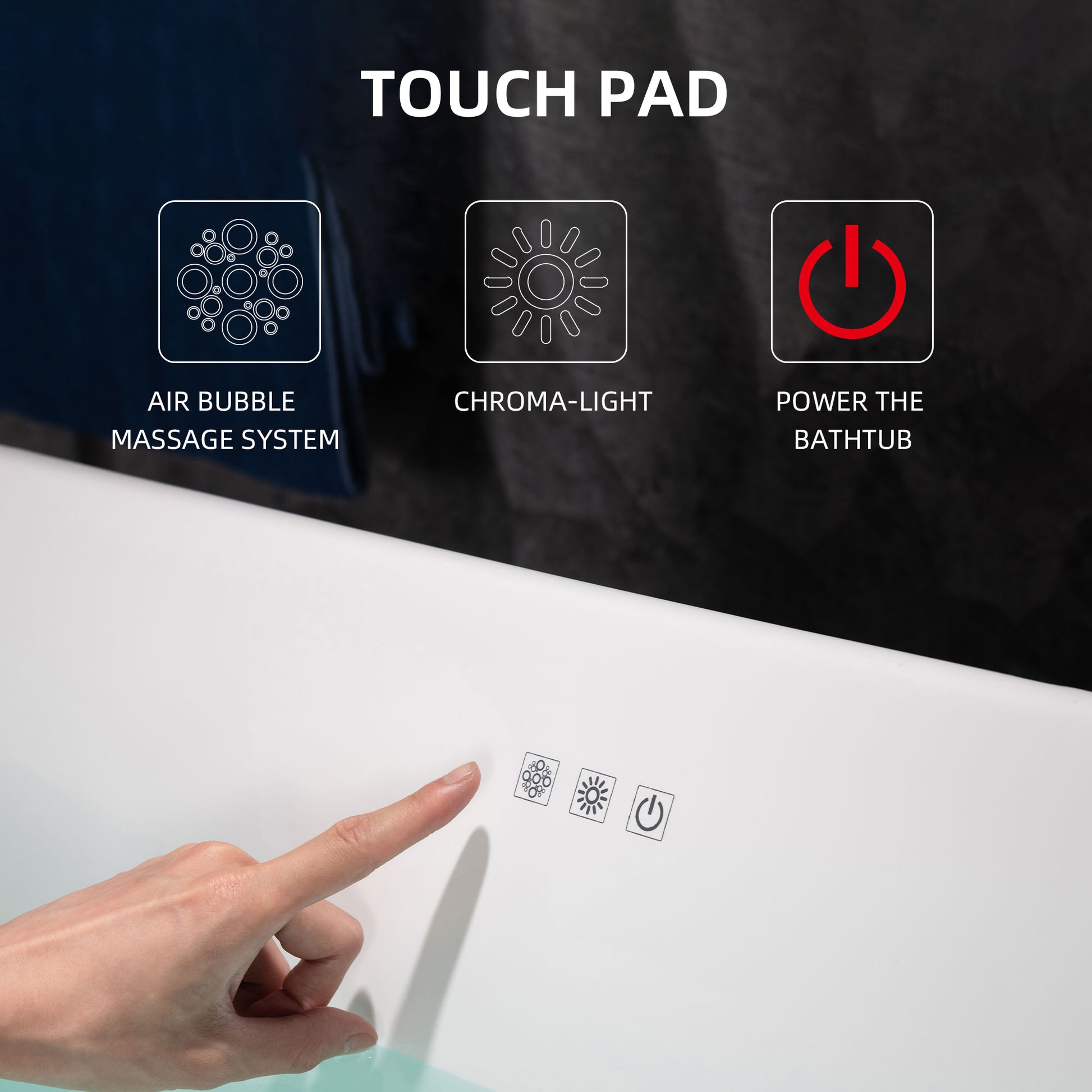 Chromotherapy Lights: The easy-operating touch panel, flush against the tub’s surface, controls the 7-color chromotherapy lights. Transform your bathroom into a personal spa with a relaxing chromotherapy experience.